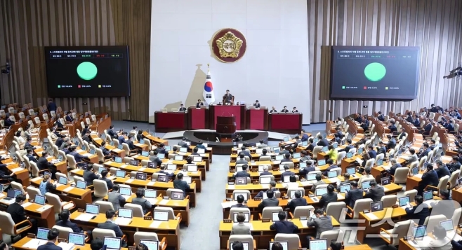 Một dự luật được thông qua tại phiên họp toàn thể lần thứ 3 của Quốc hội Hàn Quốc, diễn ra ngày 31/3, tại trụ sở Quốc hội ở Yeouido, Seoul (Ảnh: Phóng viên Lee Seung-bae/News1).