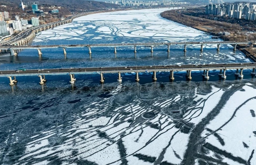 1월 28일 항공 촬영 사진에는 한강의 여러 구간이 완전히 얼어붙은 모습이 담겼다.