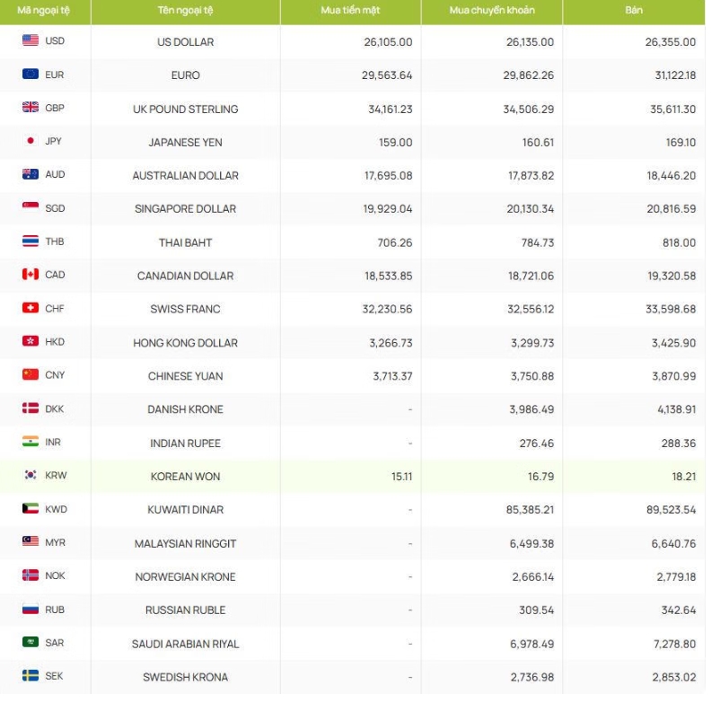 베트남 무역은행(비엣콤은행, Vietcombank)의 최신 고시에 따르면, 주요 통화 간 환율은 뚜렷한 차별화 양상을 보이고 있다. 미국 달러는 높은 수준을 유지하며 현금 매입 26,105동, 송금 매입 26,135동, 매도 26,355동에 거래되고 있다.