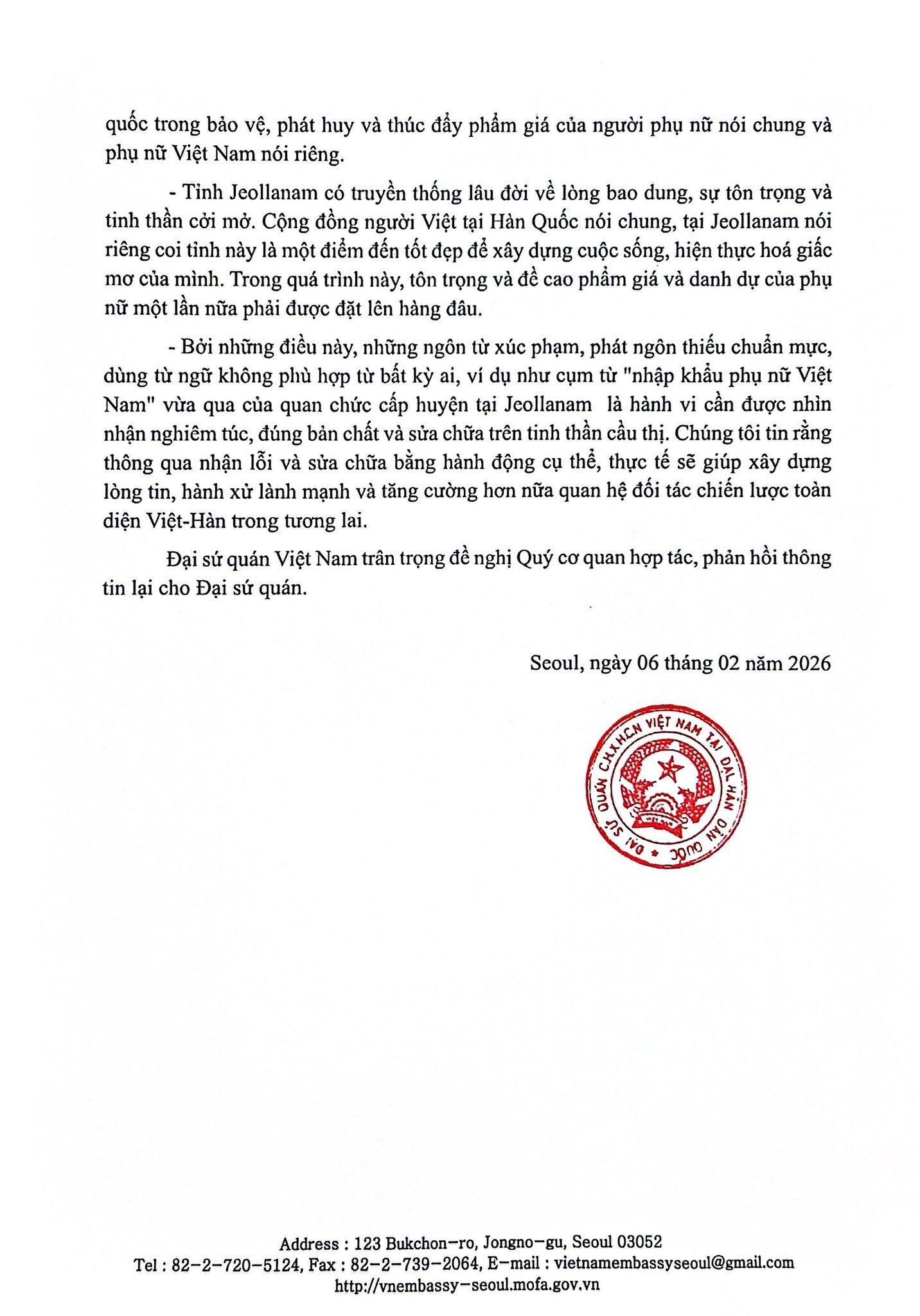 Ngày 06/02/2026, Tổng Hội Người Việt Nam tại Hàn Quốc (AVCK) cũng đã ra Thông cáo chính thức, bày tỏ quan điểm không đồng tình với cách diễn đạt thiếu phù hợp, khẳng định vai trò, phẩm giá và đóng góp to lớn của phụ nữ Việt Nam tại Hàn Quốc, đồng thời kêu gọi tiếp cận các vấn đề dân số và phát triển nông thôn trên nền tảng nhân văn – bình đẳng – tôn trọng con người.