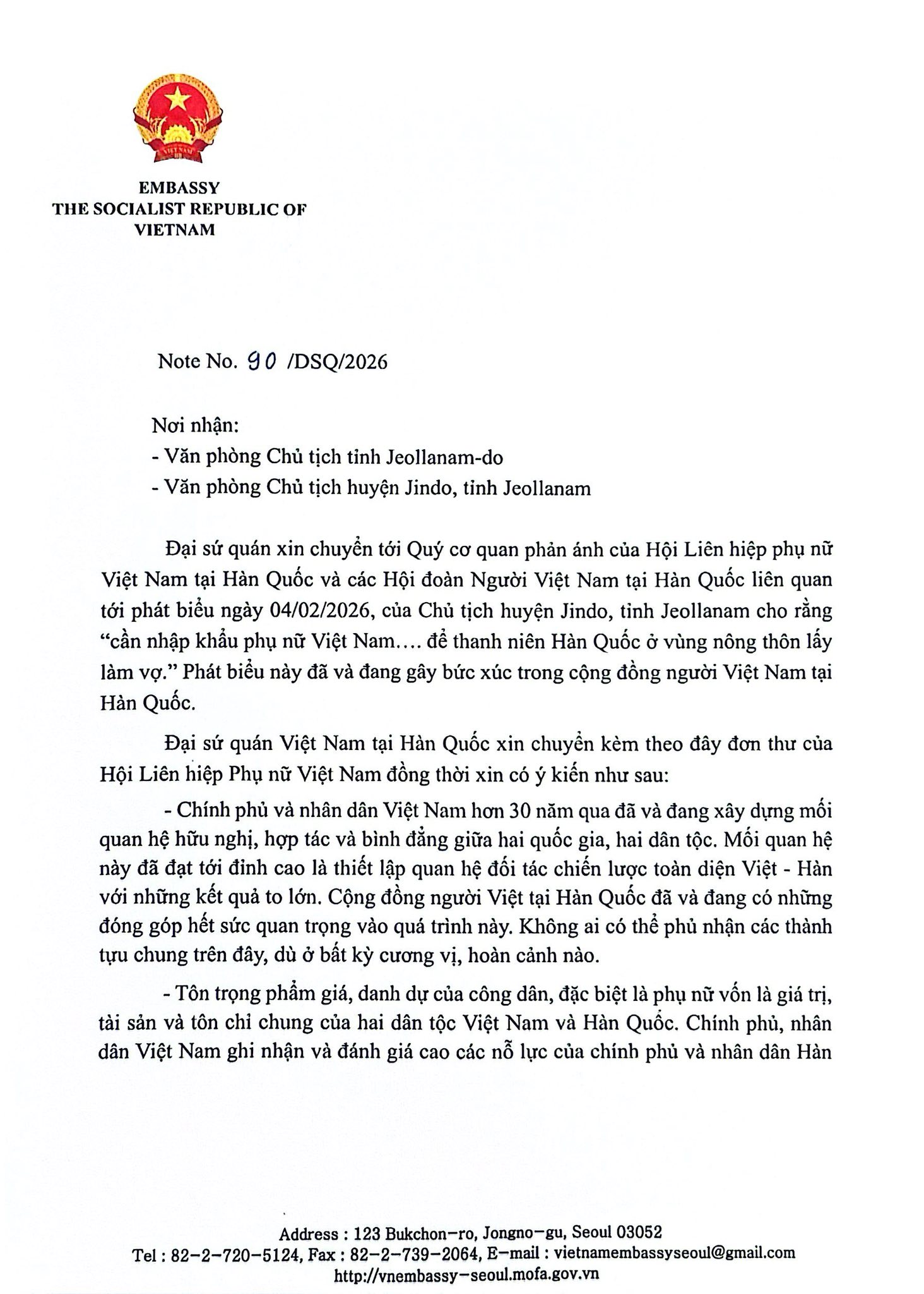 Song song đó, Hội Liên hiệp Phụ nữ Việt Nam tại Hàn Quốc cũng đã gửi công văn yêu cầu mạnh mẽ tới Chủ tịch huyện Jindo, đề nghị: