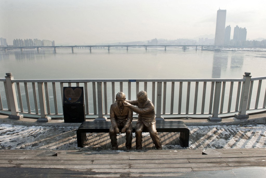Bức tượng động viên tinh thần những người gặp khó khăn trên cầu Mapo, thủ đô Seoul, Hàn Quốc - Ảnh: AFP