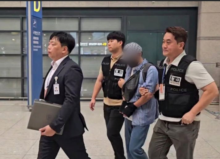 Ảnh: Nghi phạm bị dẫn độ qua Sân bay Quốc tế Incheon sau khi bị bắt tại Campuchia (Nguồn: Cảnh sát tỉnh Gangwon, Yonhap).