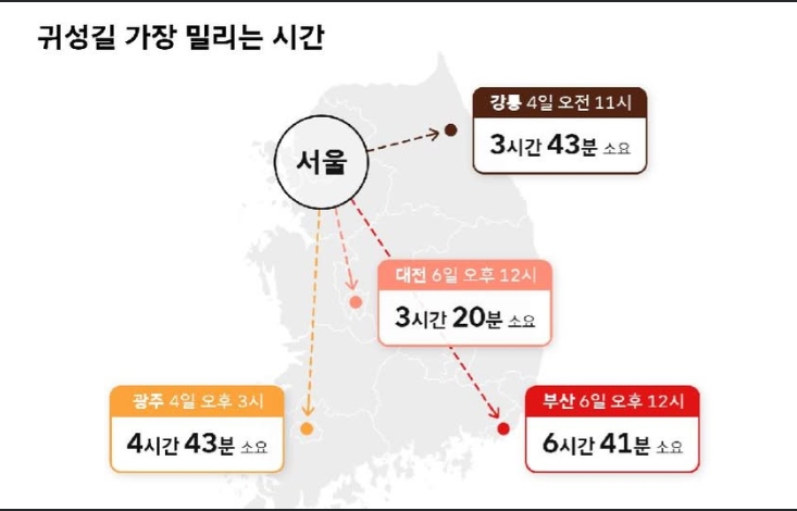 Cụ thể, trong ngày 4/10, nếu xuất phát từ Seoul đi Busan vào lúc 11h trưa, quãng đường dự kiến mất hơn 6 giờ, Seoul – Gwangju hơn 4 giờ 40 phút, Seoul – Gangneung gần 3 giờ 45 phút và Seoul – Daejeon khoảng 3 giờ 20 phút. Đỉnh điểm sẽ rơi vào trưa 6/10, khi thời gian di chuyển từ Seoul đi Busan có thể mất gần 6 giờ 41 phút, Seoul – Gwangju hơn 4 giờ 15 phút, Seoul – Gangneung khoảng 3 giờ 20 phút và Seoul – Daejeon cũng tương tự.
