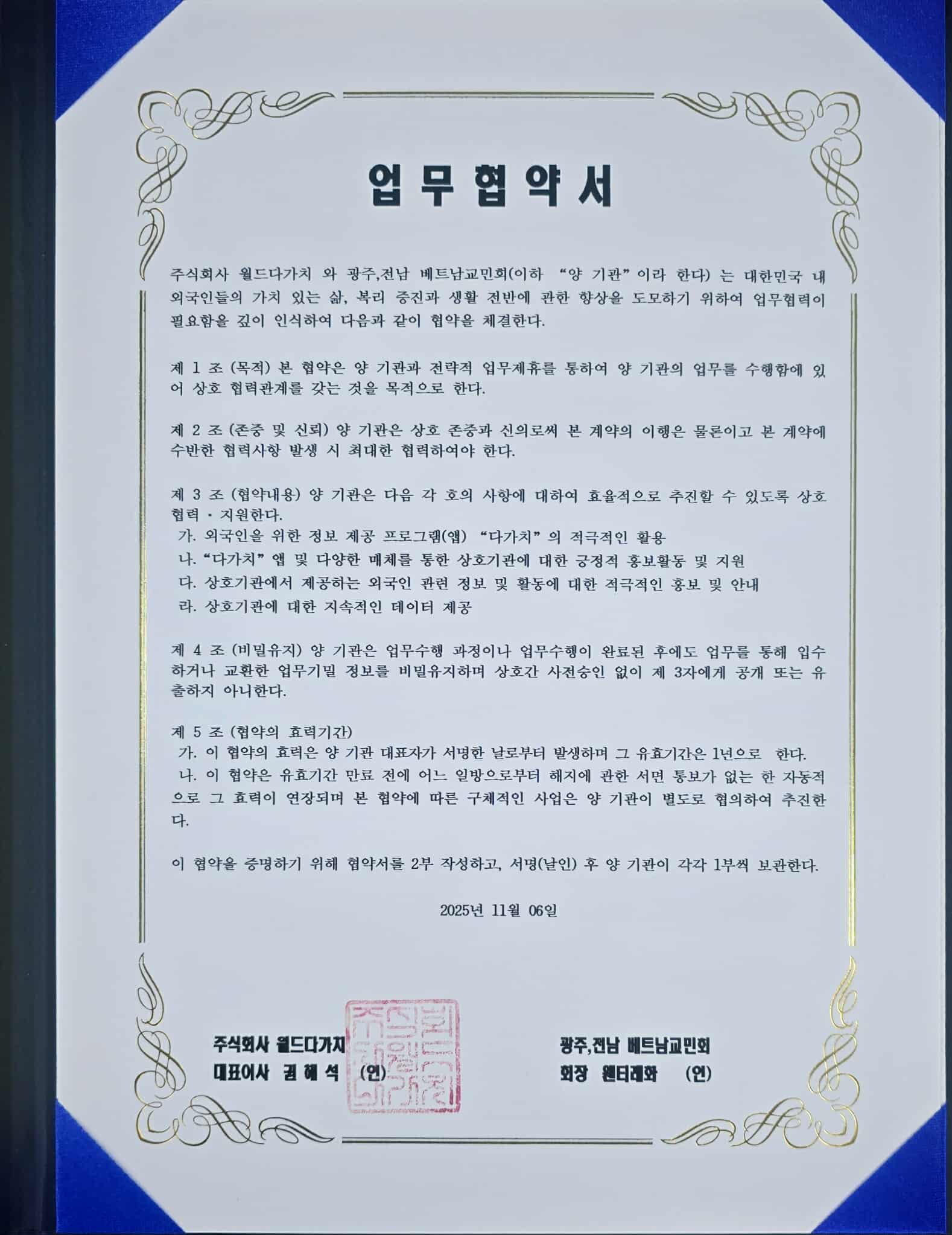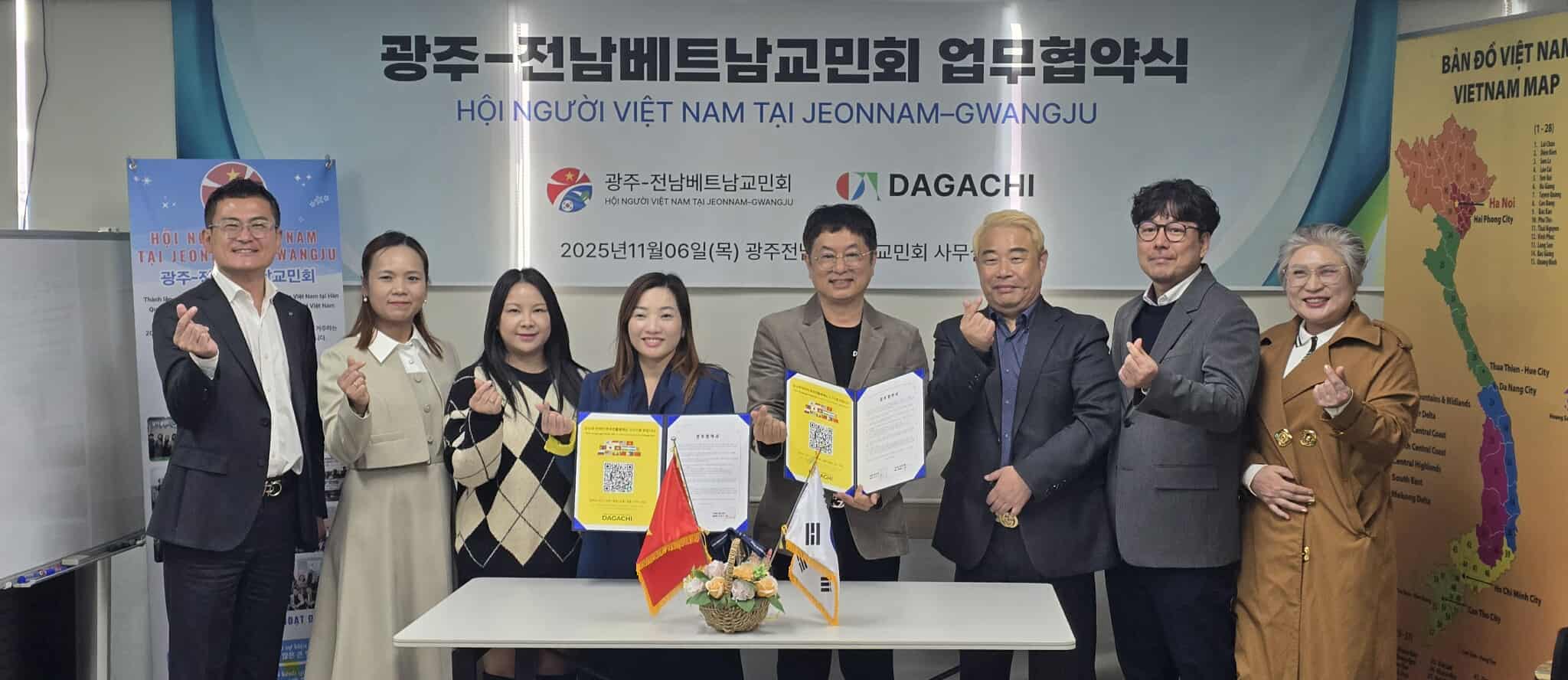 Ngày 06 tháng 11 năm 2025, tại văn phòng Hội Người Việt Nam tại Jeonnam – Gwangju, đã diễn ra lễ ký kết Biên bản ghi nhớ hợp tác (MOU) giữa Hội và Công ty Dagachi World. Buổi ký kết được tổ chức trong không khí trang trọng, thể hiện tinh thần hợp tác, đồng hành và hướng tới phát triển bền vững vì cộng đồng người Việt Nam tại Hàn Quốc.