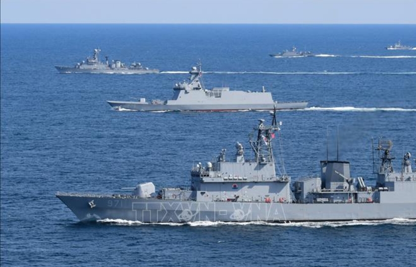 한국 해군 함정들이 2024년 3월 27일 동해상에서 실시된 훈련에 참가하고 있다. 사진: 연합뉴스/TTXVN
