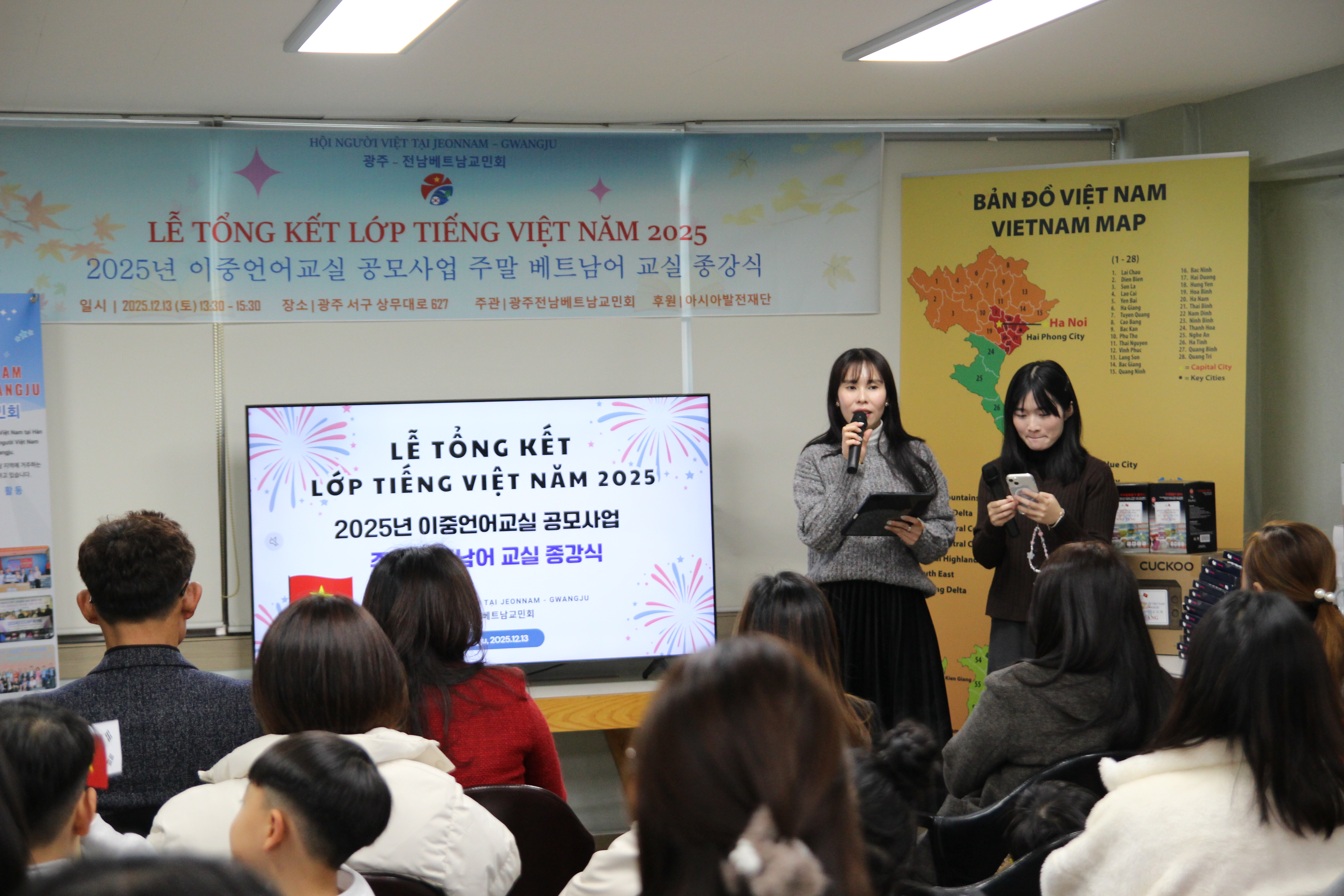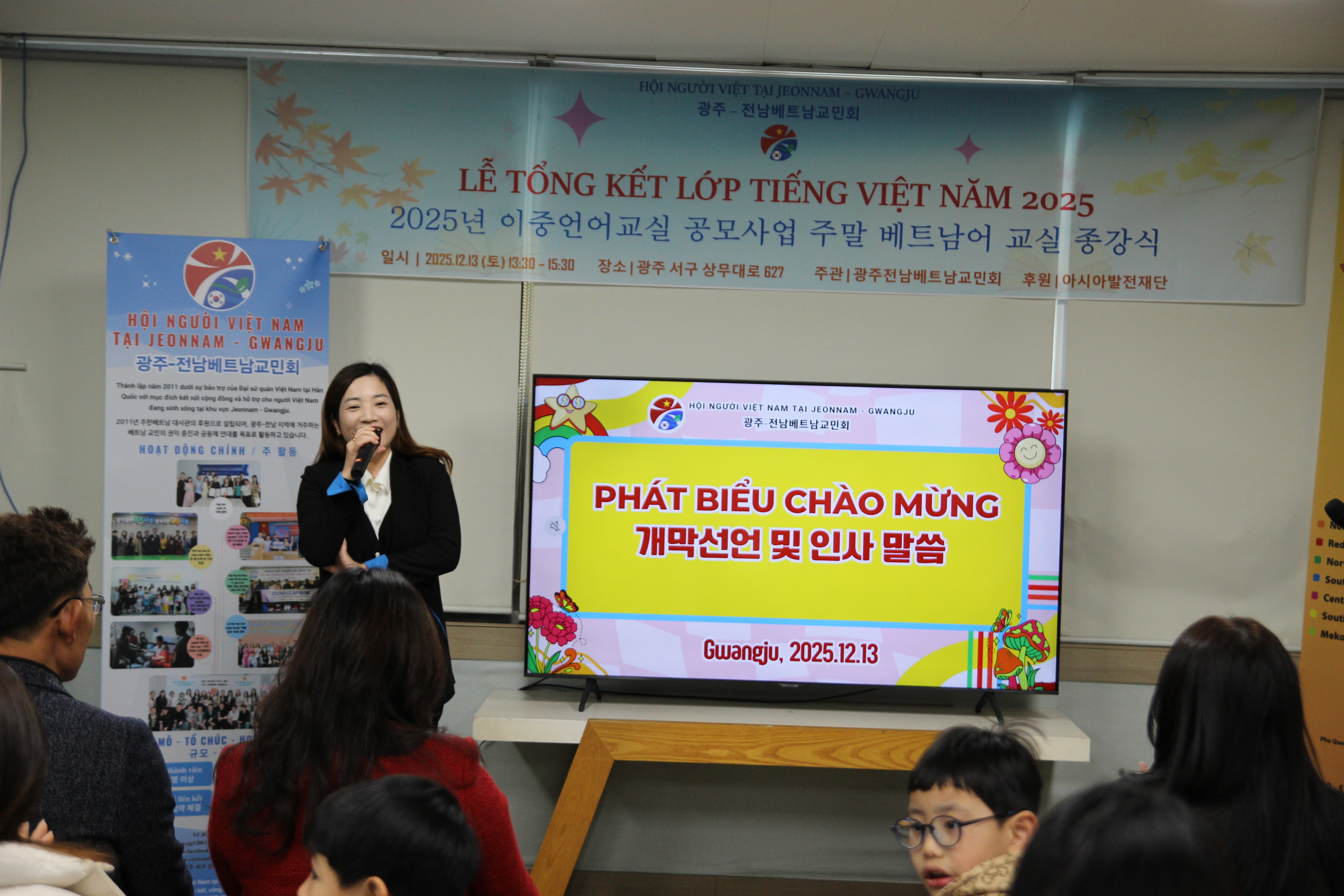 Mở đầu chương trình, Ban Tổ chức đã tuyên bố khai mạc Lễ Tổng Kết Lớp Tiếng Việt 2025. Đại diện Chủ tịch Hội người Việt tại Jeonnam – Gwangju đã có bài phát biểu ngắn gọn nhưng sâu sắc, ghi nhận những nỗ lực của giáo viên, phụ huynh và đặc biệt là các em học sinh trong suốt năm học vừa qua, đồng thời khẳng định ý nghĩa của việc duy trì và phát triển tiếng Việt trong cộng đồng người Việt tại Hàn Quốc.