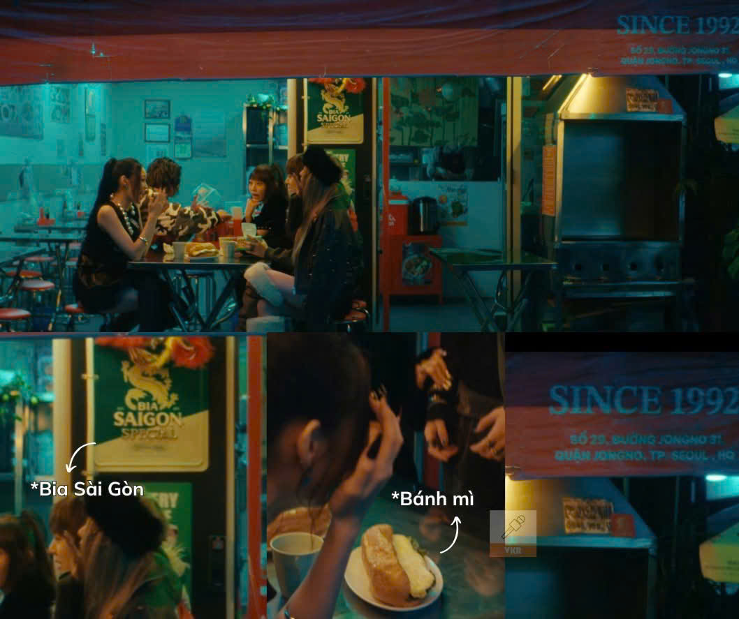 Trong phân cảnh này, khán giả dễ dàng nhận ra bàn gấp inox, lịch treo tường, banner quảng cáo bia Sài Gòn và có cả bánh mì - những chi tiết đặc trưng gợi nhắc ngay đến ẩm thực đường phố Việt Nam.